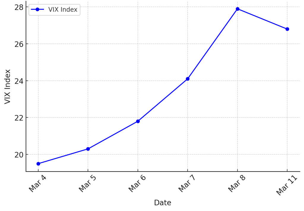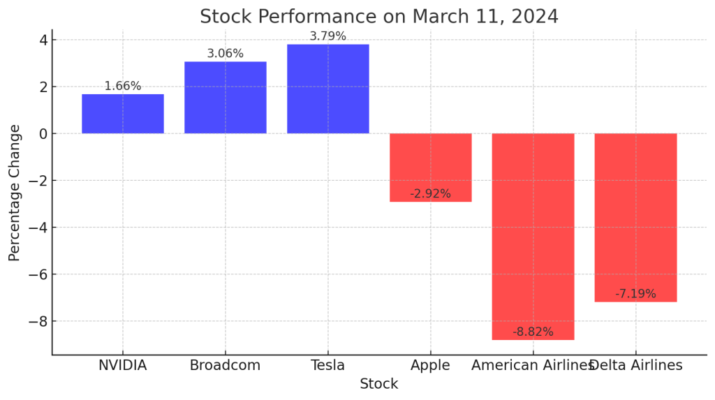 어제(3월 11일) 미국 증시는 전반적인 하락세를 보였으며, 특히 다우지수와 S&P 500 지수가 큰 폭으로 하락하였습니다. 반면 일부 기술주들은 저점 반등을 시도하며 혼조세를 보였습니다.